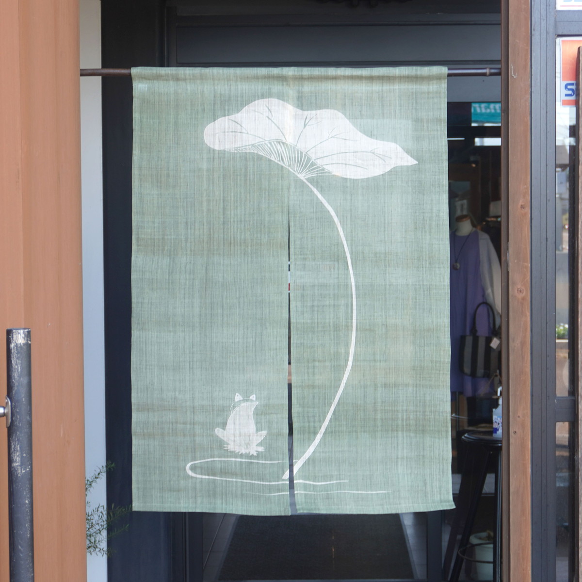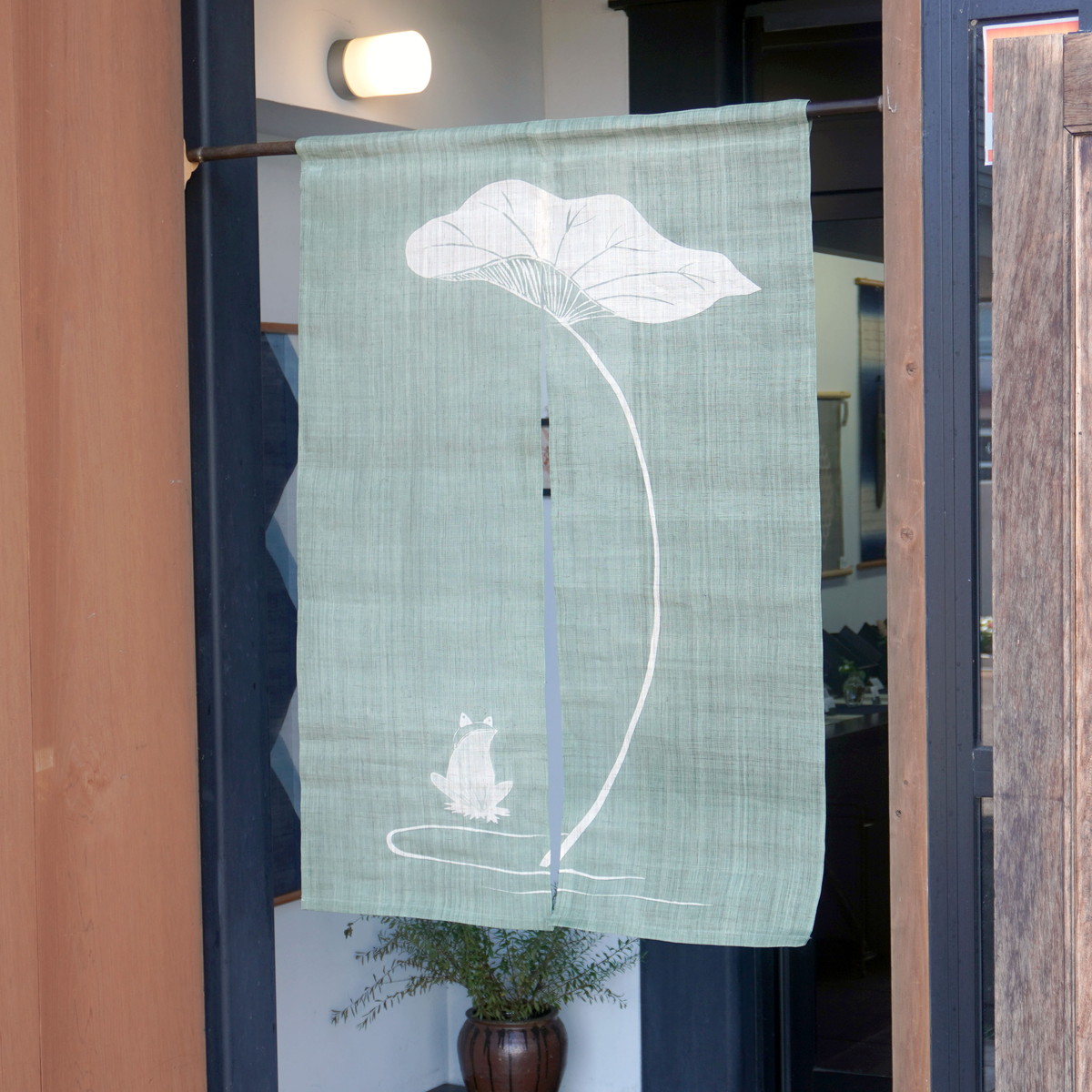 ほどよい透け感と麻ならではの爽やかなシャリ感が美しい麻のれんです。落ち着いたグリーンを基調とした麻100%の生地に可愛らしい蛙のデザインを施しました。色は新潟小千谷の地で職人が染め上げており、手仕事の温もりと自然そのままの風合いをお楽しみ頂けます。