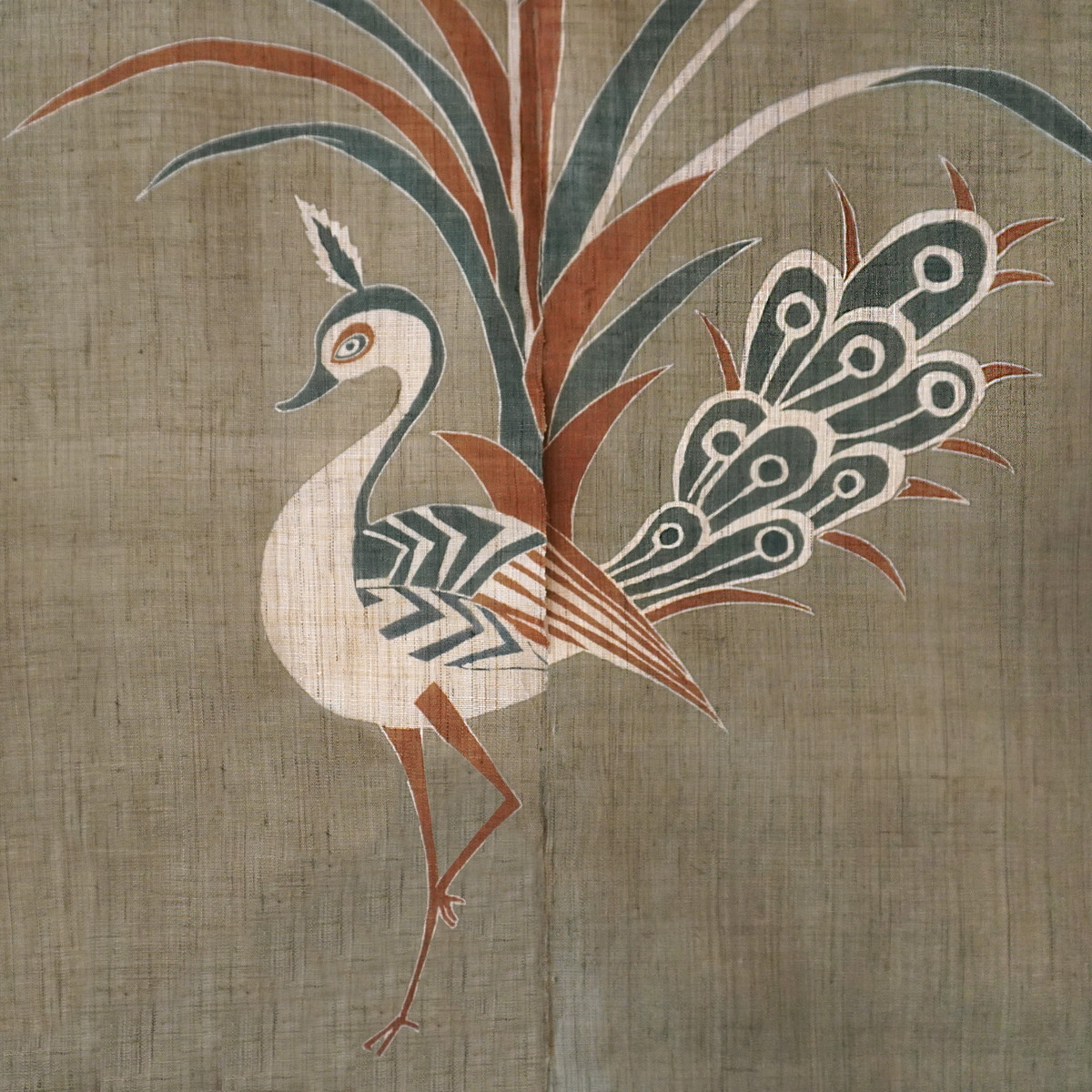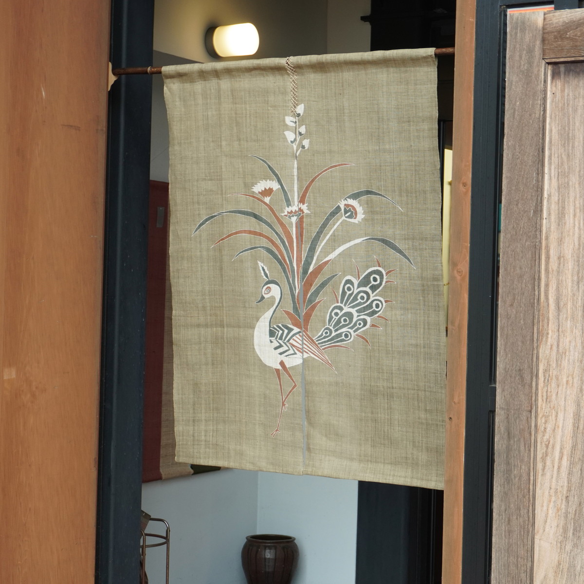 大胆な花樹と孔雀の柄を組み合わせた厳かな麻のれんです。