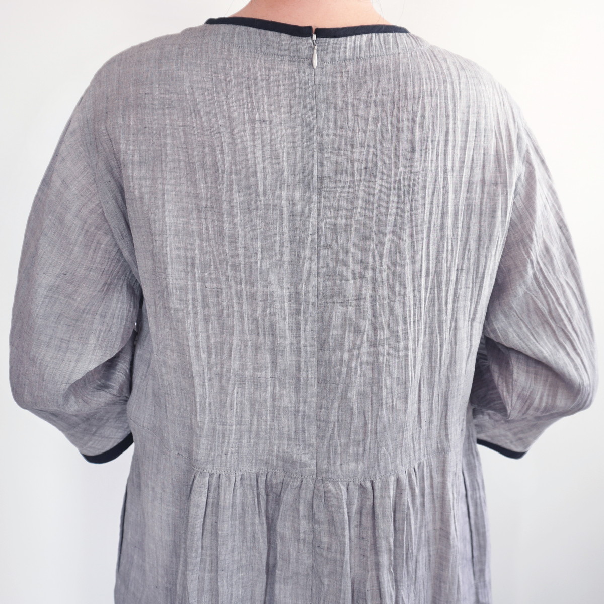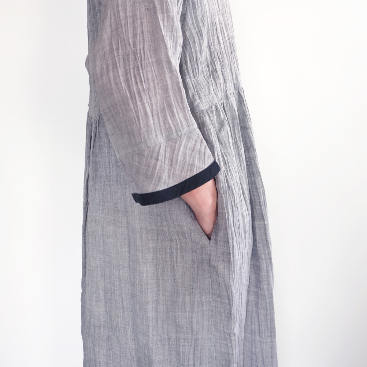 こちらの洋服は新潟県小千谷市の伝統織物「小千谷縮/おぢやちぢみ」をベースに改良を加えた自社オリジナル「縮布/ちぢみ布」を素材に用いています。質感は非常にサラッとしていて汗ばむ季節も肌にまとわりつかず爽やかな着心地です。また、軽くて丈夫な上に取り扱いも容易で、手洗いは勿論ネットに入れて洗濯機でも洗えます。