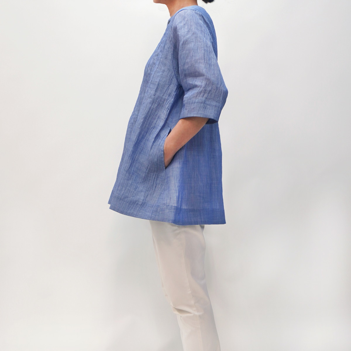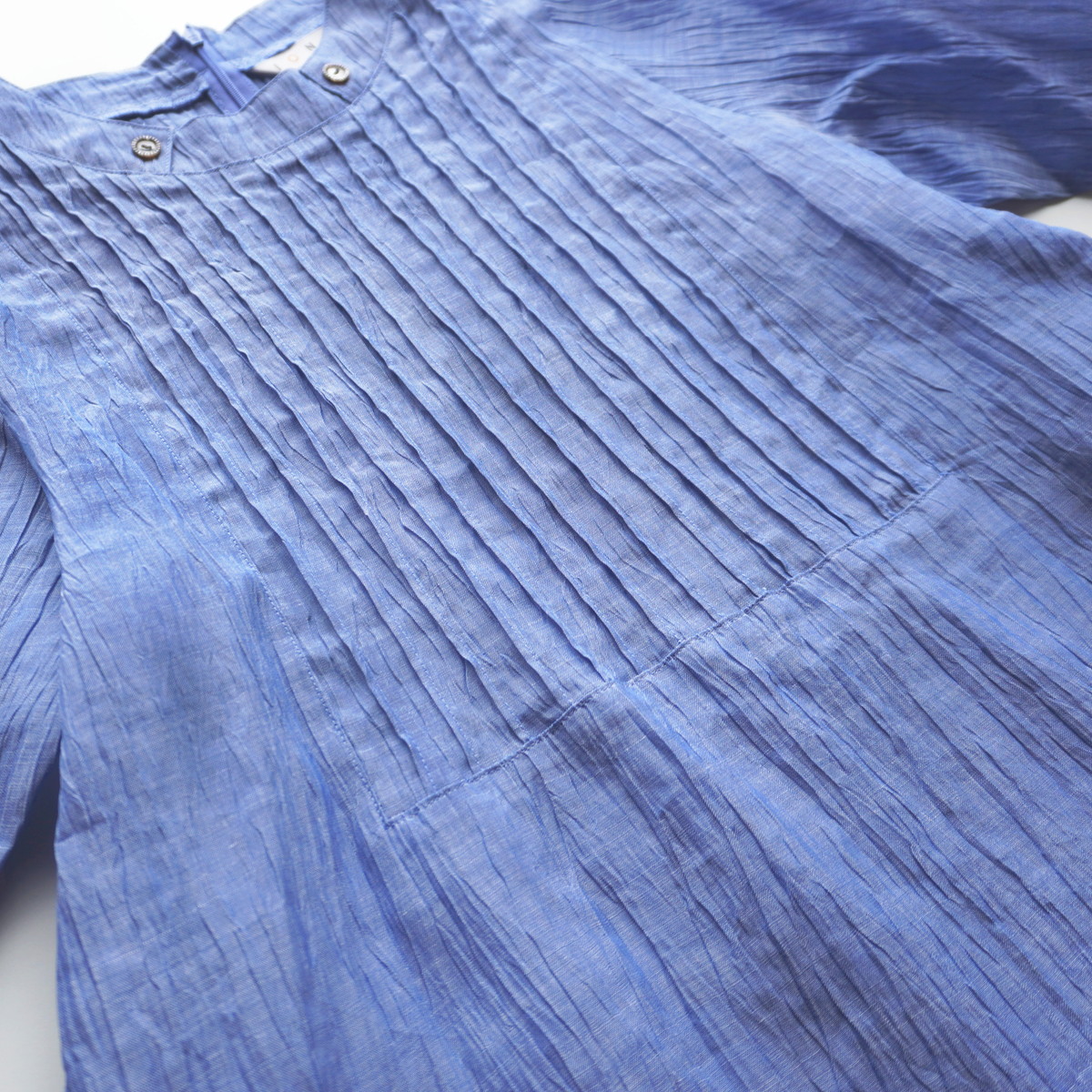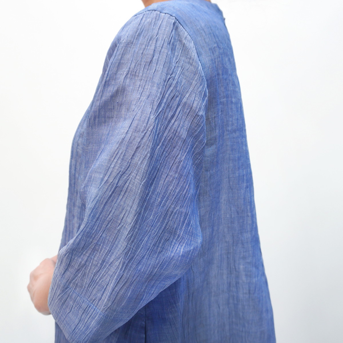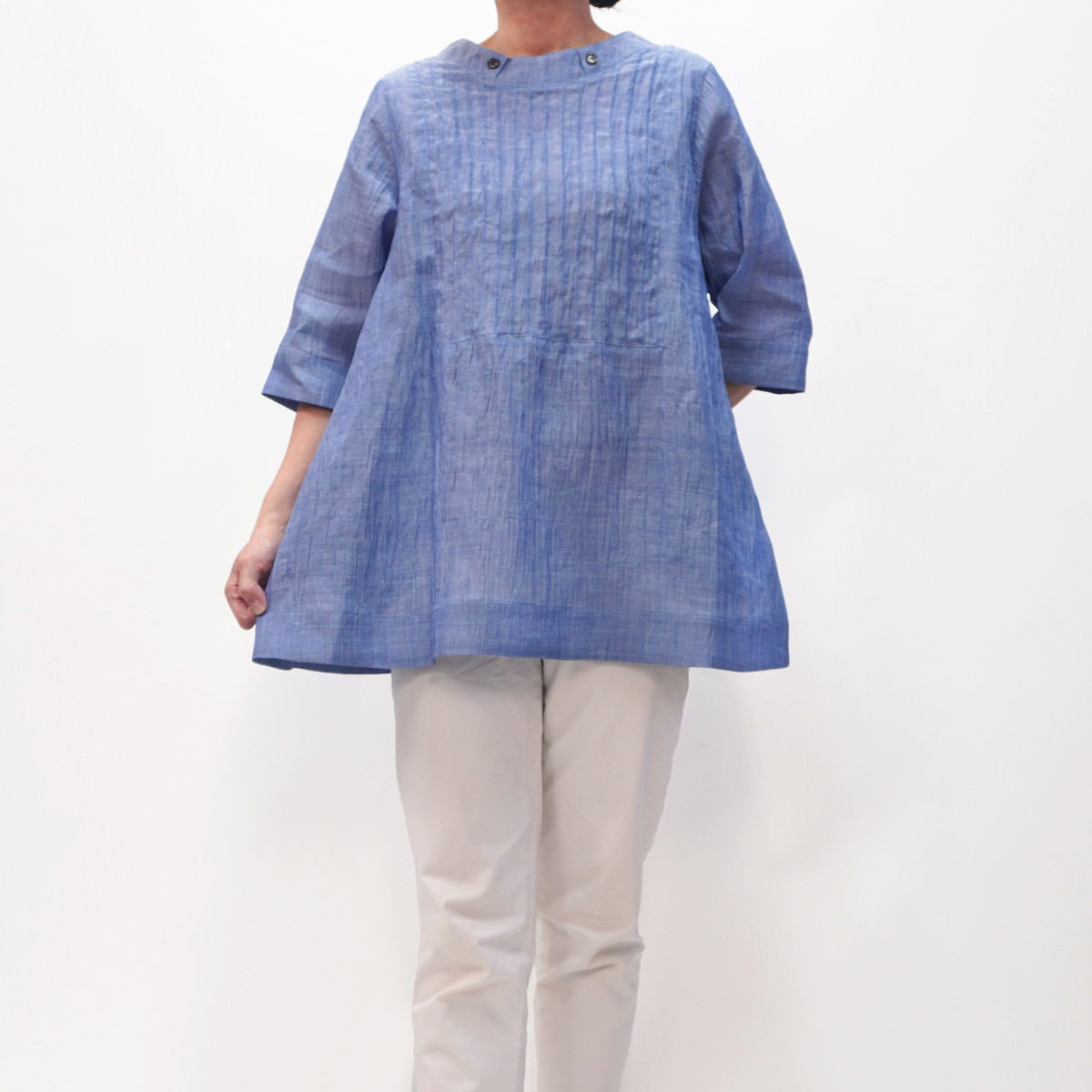 こちらの洋服は新潟県小千谷市の伝統織物「小千谷縮/おぢやちぢみ」をベースに改良を加えた自社オリジナル「縮布/ちぢみ布」を素材に用いています。質感は非常にサラッとしていて汗ばむ季節も肌にまとわりつかず爽やかな着心地です。また、軽くて丈夫な上に取り扱いも容易で、手洗いは勿論ネットに入れて洗濯機でも洗えます。