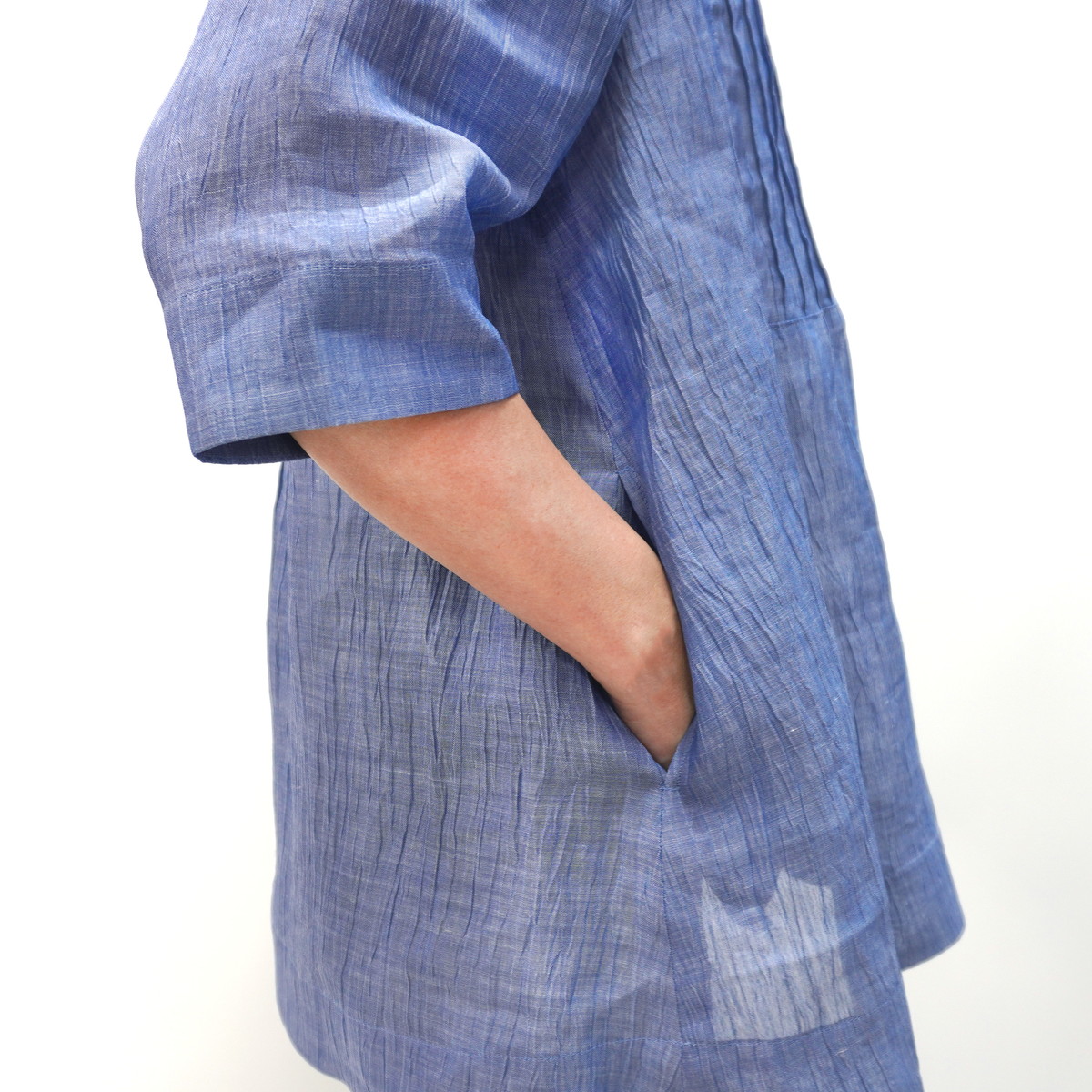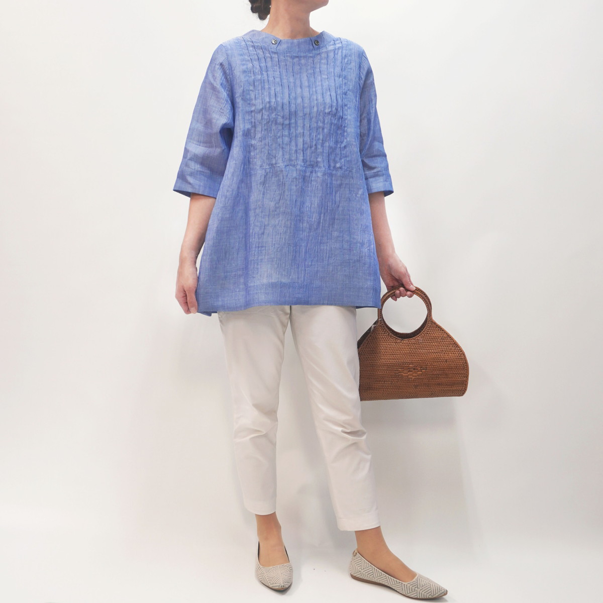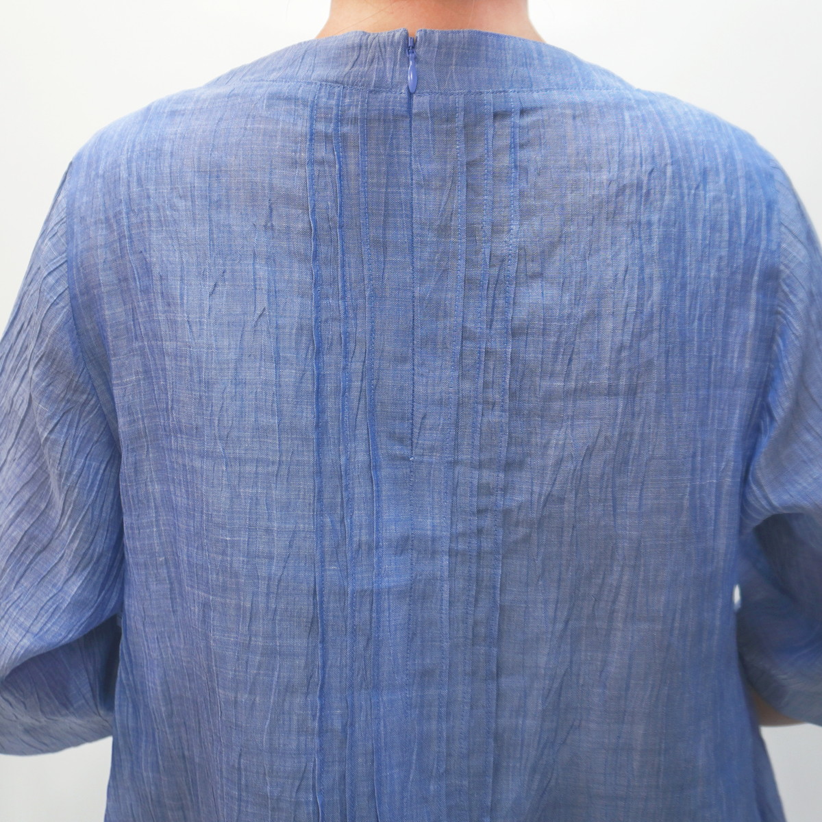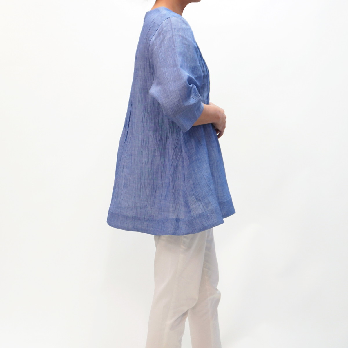 こちらの洋服は新潟県小千谷市の伝統織物「小千谷縮/おぢやちぢみ」をベースに改良を加えた自社オリジナル「縮布/ちぢみ布」を素材に用いています。質感は非常にサラッとしていて汗ばむ季節も肌にまとわりつかず爽やかな着心地です。また、軽くて丈夫な上に取り扱いも容易で、手洗いは勿論ネットに入れて洗濯機でも洗えます。
