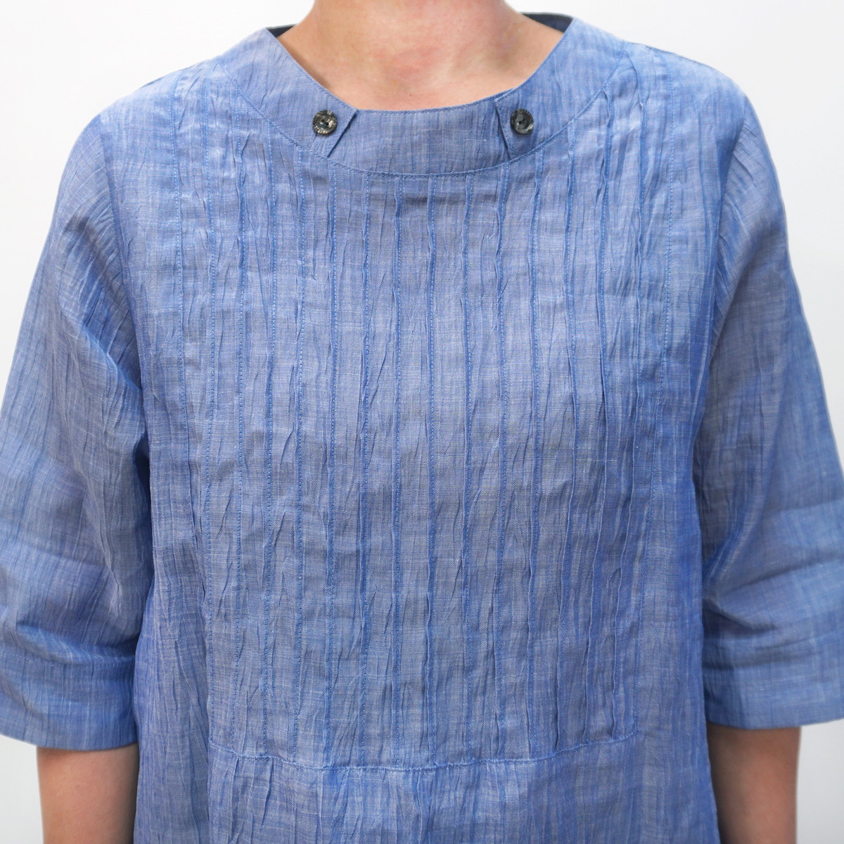 胸元にピンタック生地を切り替えた立体感と華やぎをプラスしたチュニック。