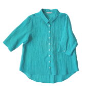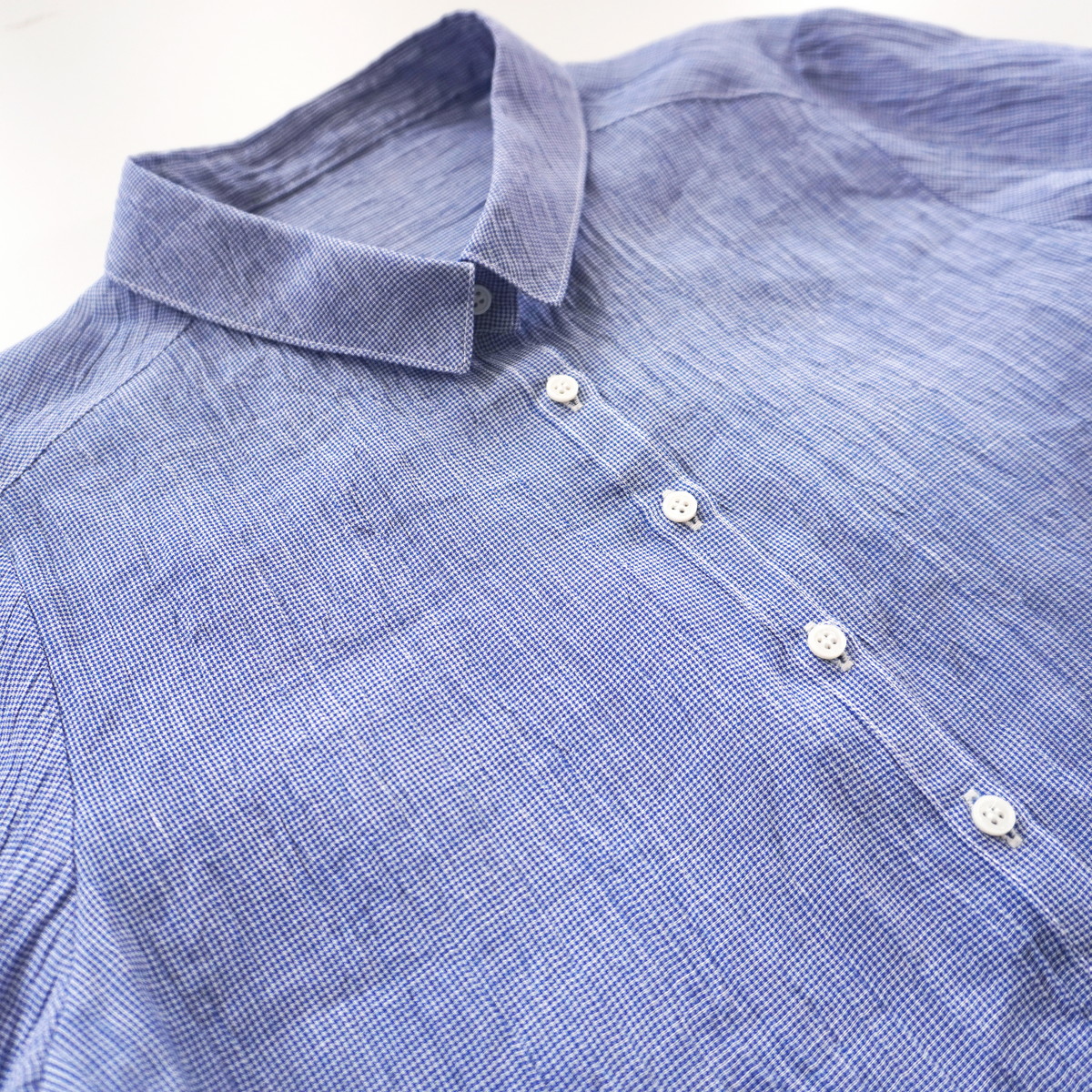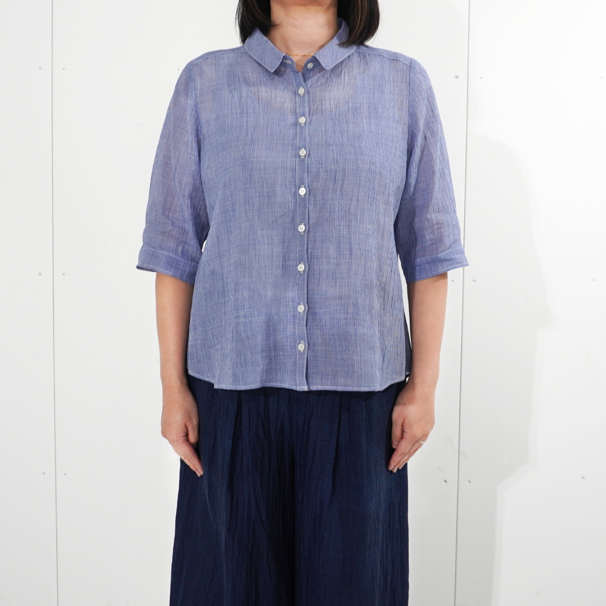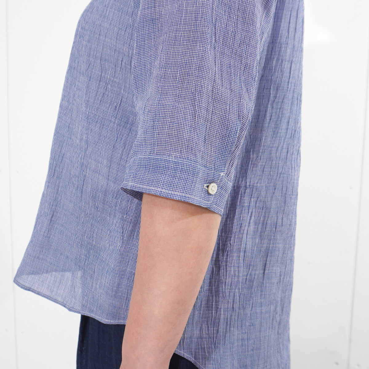 こちらの洋服は新潟県小千谷市の伝統織物「小千谷縮/おぢやちぢみ」をベースに改良を加えた自社オリジナル「縮布/ちぢみ布」を素材に用いています。質感は非常にサラッとしていて汗ばむ季節も肌にまとわりつかず爽やかな着心地です。また、軽くて丈夫な上に取り扱いも容易で、手洗いは勿論ネットに入れて洗濯機でも洗えます。