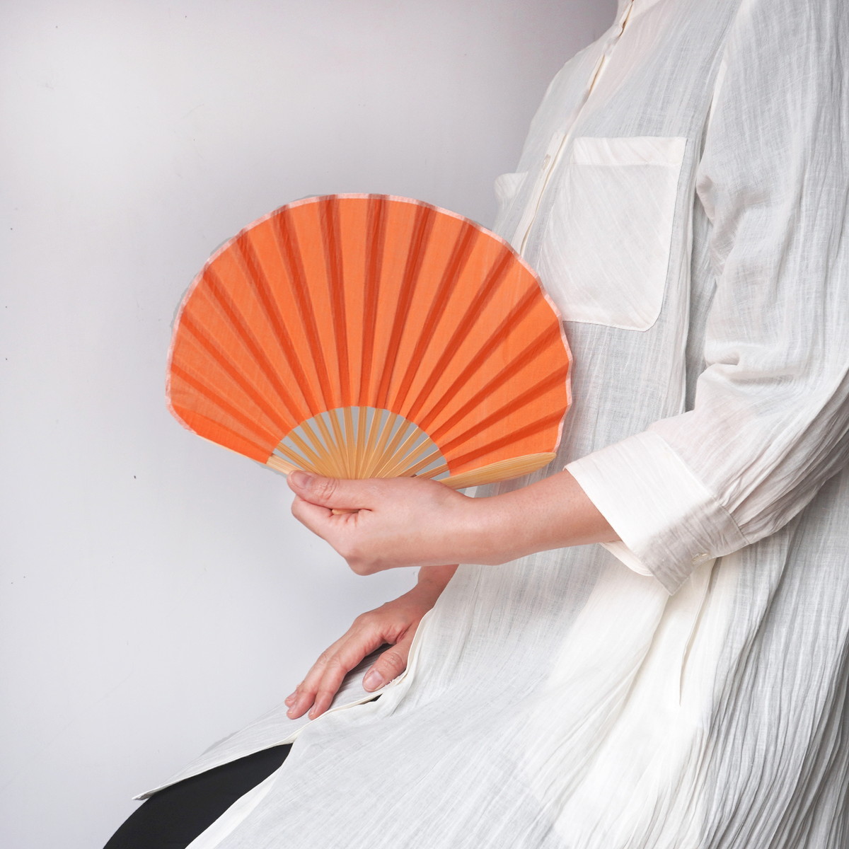 この製品に使用されている「縮布」は、職人がお湯の中で麻生地を丹念に揉み込む「湯もみ」と呼ばれる作業によりシボ(皺)加工を施したものです。さらっとした触感と爽やかな見た目の素材感により、シンプルながら上品で繊細な扇子に仕上がっております。