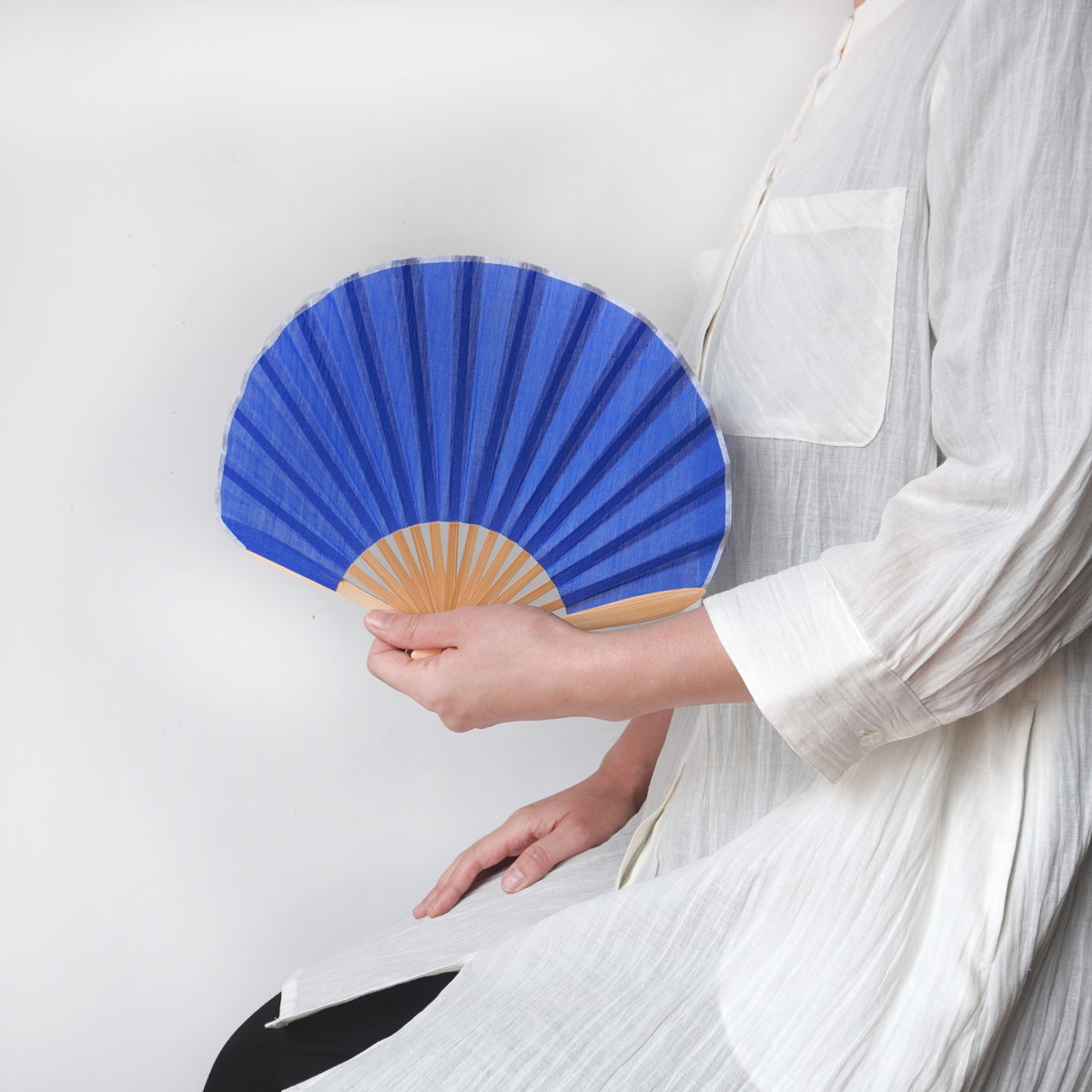 この製品に使用されている「縮布」は、職人がお湯の中で麻生地を丹念に揉み込む「湯もみ」と呼ばれる作業によりシボ(皺)加工を施したものです。さらっとした触感と爽やかな見た目の素材感により、シンプルながら上品で繊細な扇子に仕上がっております。